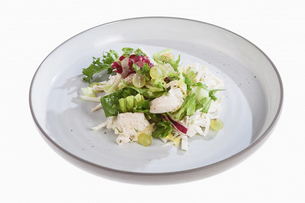 Знаменитый салат, придуманный больше сотни лет назад в нью-йоркском отеле «Уолдорф-Астория». Винограда тут немало, и он играет одну из главнейших ролей, поэтому попробуйте его сначала, прежде чем добавлять в салат. Рецепт взят из книги «Гордон Рамзи. Полезная еда».