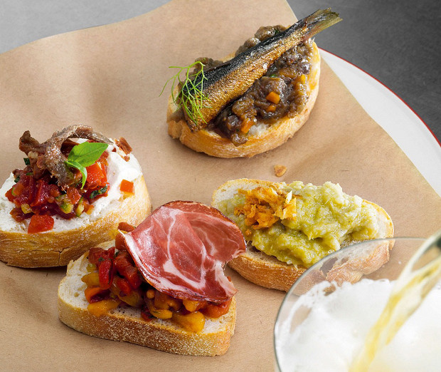 Тут шпроты встречаются с домашней икрой из баклажанов — выходит душистая, сочная брускетта со сложносочиненным вкусом.