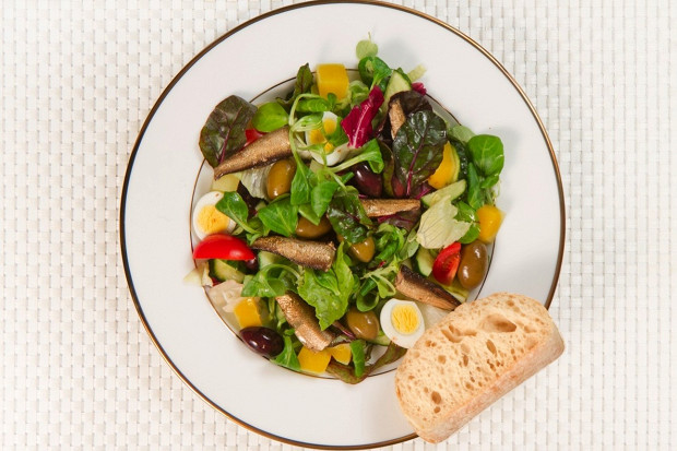 Наш ответ средиземноморскому салату нисуаз: картофель, помидоры, перепелиные яйца, зелень, каперсы и рыба — в этом случае шпроты.