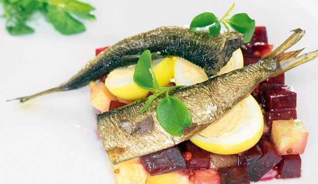 Убедительный баланс белков, жиров и углеводов. Шпроты в компании нежных перепелиных яиц и печеных свеклы с репой, взятых в равных пропорциях.