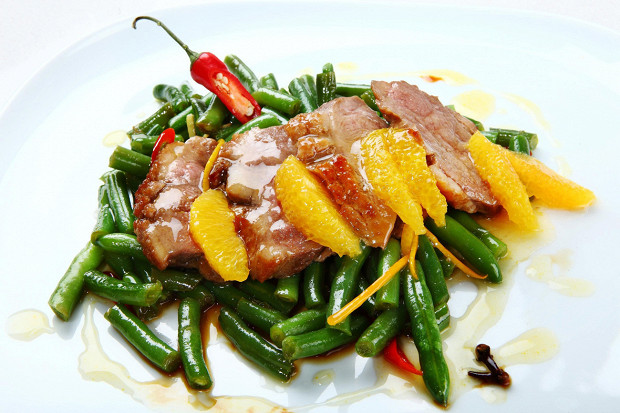 Утиная грудка в апельсиновой глазури с зеленой фасолью