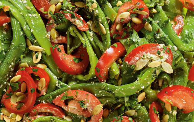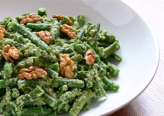 Тыквенные семечки, а особенно превращенные в песто, становятся тем самым носителем яркого вкуса, который очень украшает зеленую фасоль.