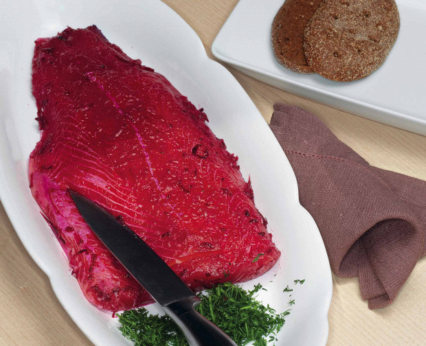 Один из самых красивых рецептов засолки лосося: рыба, соединившись со свеклой, хреном и имбирем, становится куда краше и сложнее.