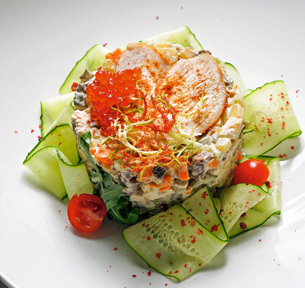Этот рецепт родом из ресторана «Дворянское собрание», открывшегося в одноименном отеле. Собственно, и искать его надо в здании Дворянского собрания на проспекте Ленина. Салат насыщенный: в ход идут и отварная говядина, и говяжий язык, и копченая курица.