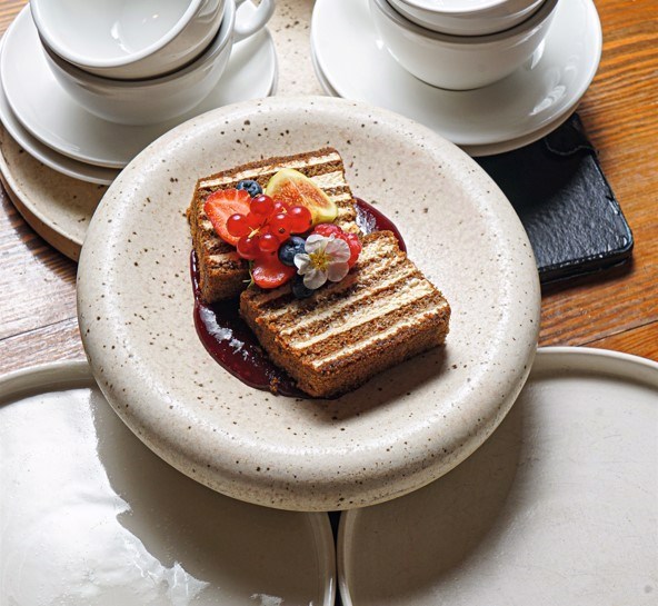 Ресторан «Берендей» находится практически в лесу, отчего местный медовик из гречишного меда и черемуховой муки практически сливается с природой.