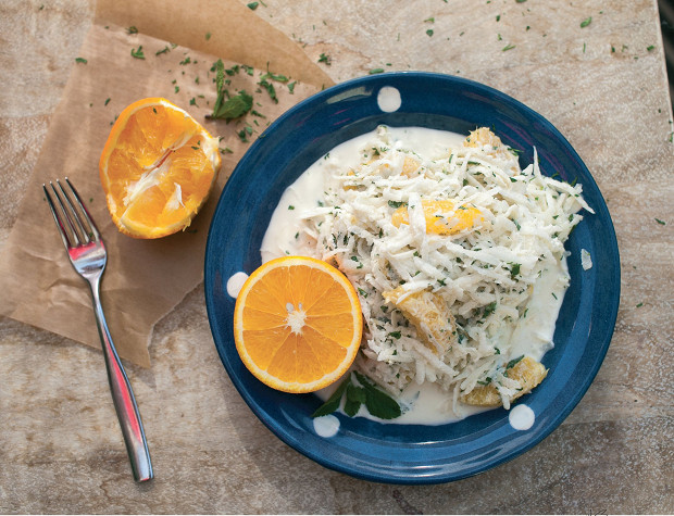 Салат, которым легко утолить тоску по лету. Сочная редька, сочный апельсин и мягкий йогурт, утихомиривающий бодрость фруктово-овощных соков.