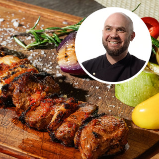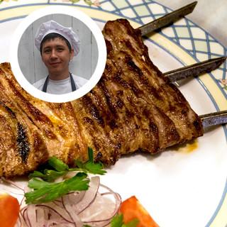 Осетр — рыба царских кровей и требует особого к себе отношения. Чтобы подчеркнуть достоинства его перламутровой спинки, шеф-повар ресторана «Матрешка» на 8 часов оставляет куски осетрины в затейливом маринаде с газированной водой: пузырьки внедряются в жирную мякоть и передают ей ароматы специй, остроту лука и сдержанную кислоту помидоров. Тут главное — не передержать шашлык, сначала в маринаде, потом на огне, пусть перламутровый блеск сохранится. И в довершении сюжета к готовому шашлыку из осетрины на тарелку ставится корона в виде печеной луковицы с домашней аджикой.