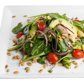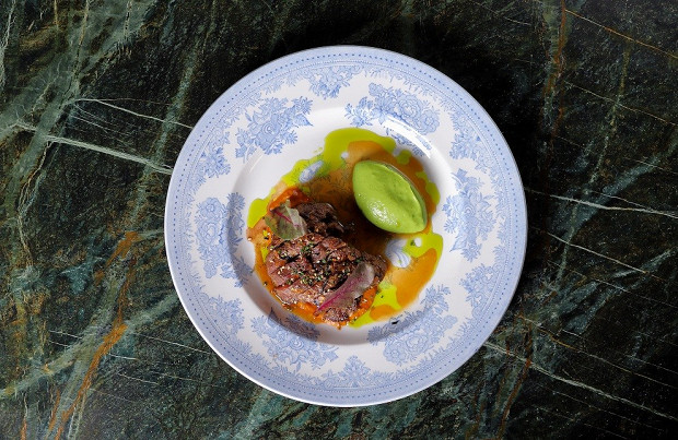 Шашлыков из тунца пока никто не придумал, но стейк из тунца на гриле — вполне осуществимое даже в наших широтах, хотя и дорогое удовольствие. Мясо тунца недаром внешне напоминает говядину, и жарят его по тем же правилам, что и премиальный рибай: нужно едва обжечь пунцовый кирпичик мякоти с обеих сторон, оставив внутри сырым и искрящимся соком и ни в коем случае не доводить до фатальной полной прожарки. В рецепте Владимира Чистякова взбитый со льдом авокадо, зеленое луковое масло и щепотка японской приправы фурикакэ, как удачный багет, обрамляют красивый кусок тунцовой щеки на тарелке.