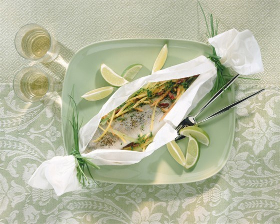 Рецепт заимствован из арсенала бывалых рыбаков, которые всегда носят с собой в рюкзаке старые газеты, чтобы развести костер на берегу. С рыбой они поступают очень просто: даже не чистя и не потроша, плотно заворачивают в несколько слоев мокрой газеты и опускают в прогоревшие угли. Если интимная близость газеты и рыбы вас смущает (все-таки типографская краска не полезна), можно подстраховаться и сперва завернуть в два слоя вощеной бумаги для выпечки, а лишь потом — в три-четыре газетных листа. Опустить в емкость с водой, чтобы все слои пропитались, и отправлять на мангал. Рыба будет готовится в коконе из влажного пара, и получится такой нежной и сочной, что филе само отойдет от костей.