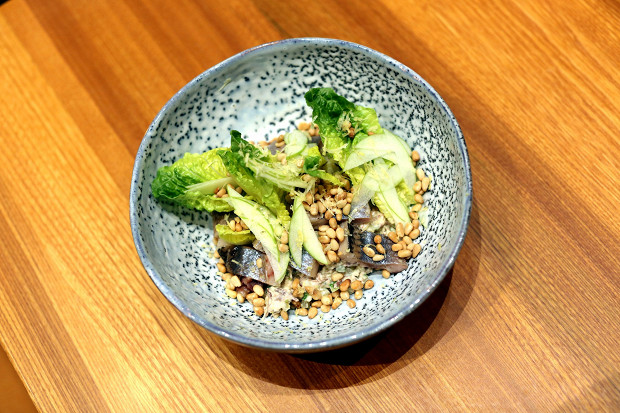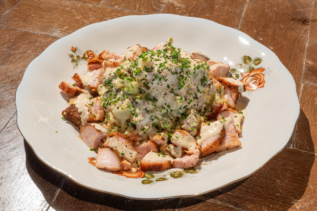 Красивый салат, напоминающий идеальную водочную закусочную тарелку. Представьте, что у вас лежат рядом картошка, соленый огурец, квашеная капуста, грузди и зеленый лук. А тут то же самое, только замешенное в виде салата. Так готовят салат в московском ресторане сибирской кухни «Сибирьсибирь».