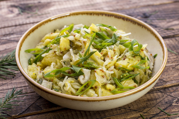 Латвийский национальный салат, где есть место и селедке, и сметане, и огурцам — свежим и зеленым, опять же выступающим на равных, — и даже горчице со сливочным хреном.