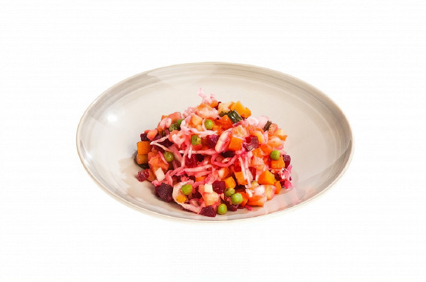 Классический винегрет хорош тем, что сладкая свекла тут здорово подчеркивается соленым огурцом. В память о соусе винегрете, давшем название салату, мы заправляем этот салат миксом масла и уксуса.