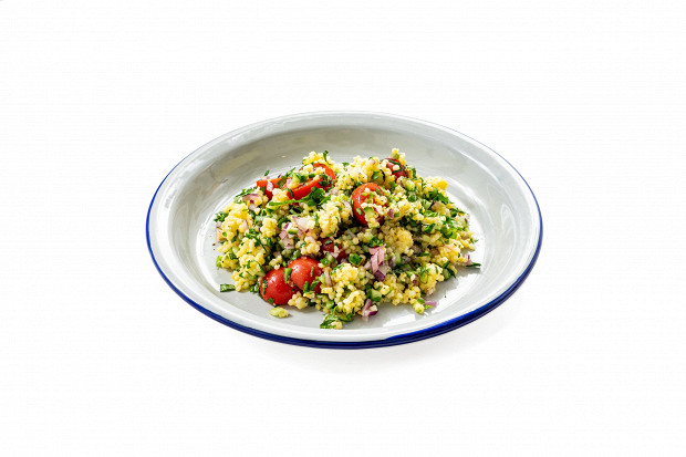 Редкий салат с непривычным набором ингредиентов: тут и пшено, и красный лук с кинзой, и помидоры черри со свежей мятой, и соленый огурец, который очень непривычно и хорошо ладит со средиземноморской заправкой из оливкового масла и лимона.