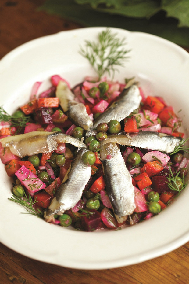 Не винегрет, а праздник! Сладкая свекла и сладковатый горошек здорово сочетаются с соленой килькой. Идеально, если овощи для салата вы запечете, как указано в этом рецепте, а не сварите.