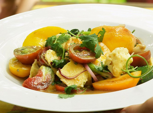 Сладкие летние помидоры, сочащиеся приторным соком сезонные персики и чуть солоноватый сыр халуми — если это не идеальный соус, то на земле просто не существует идеала. Вместо халуми можно использовать адыгейский сыр или сулугуни, но лучше все-таки поискать халуми.