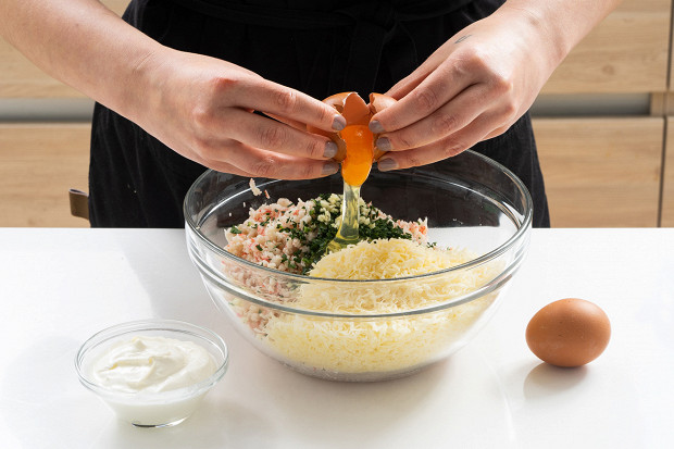Смешайте в миске крабовые палочки, 200 г тертого твердого сыра, петрушку, чеснок. Разбей в миску 2 яйца, добавьте 1 ст. л. сметаны, посолите, поперчите и все хорошенько перемешайте.
