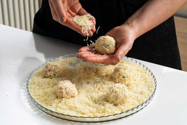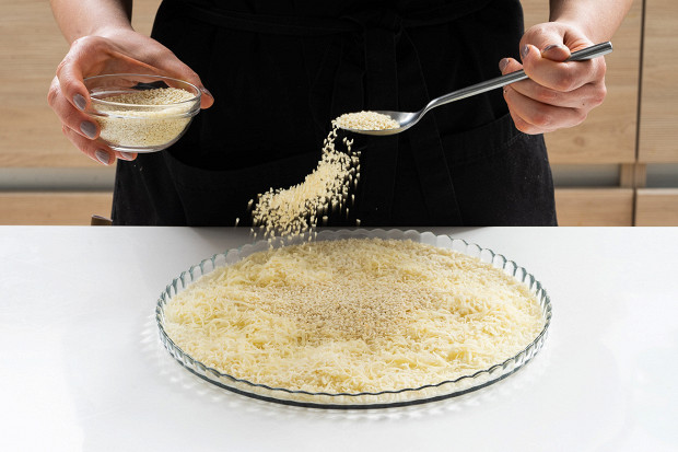 Приготовьте панировку, смешав в отдельной неглубокой миске 1 ст.л. тертого сыра, 2 ст.л. кунжута и 50 г панировочных сухарей.