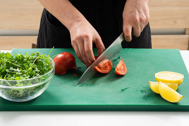 На гарнир приготовьте салат: крупно нарежьте 2-3 помидора, смешайте с любым микс-салатом, заправьте оливковым маслом, сбрызните лимонным соком, поперчите, посолите и перемешайте.