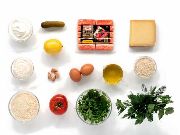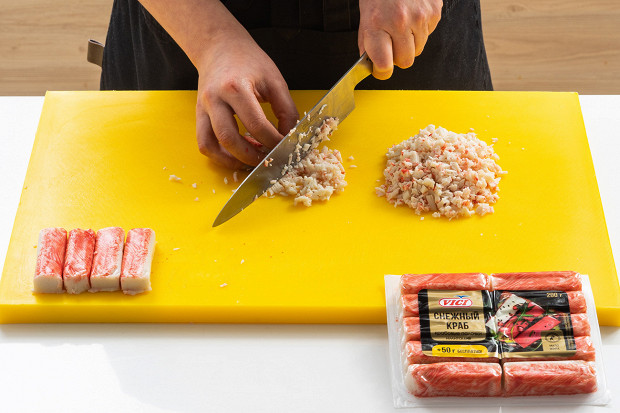 Подготовьте все ингредиенты – на 4 порции крабкейков вам понадобится 2 упаковки крабовых палочек по 200 г.