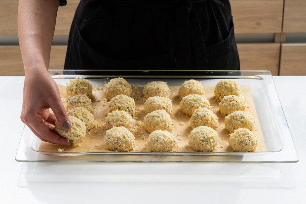 Из фарша с крабовыми палочками сформируйте небольшие круглые котлетки, обваляйте их в панировке и выложите на смазанный растительным маслом противень.