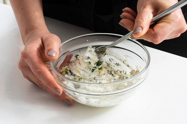 Тем временем приготовьте соус: выложите в миску 4 ст.л. майонеза, добавьте измельченный зубчик чеснока. Порубите соленый огурец, веточку укропа и добавьте в соус. Все перемешайте.