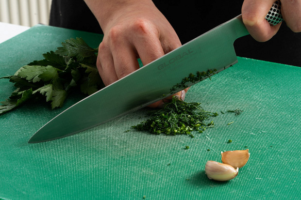 Измельчите 2 зубчика чеснока, мелко нарежьте по паре веточек петрушки и укропа (лучше использовать только листья, чтобы крабкейки получились нежнее).