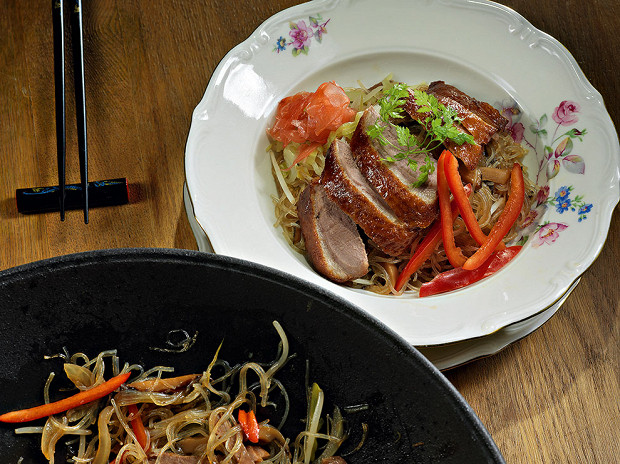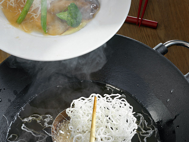 А из обычной тонкой рисовой лапши в воке могут сделать что угодно — и хрустящие клубки, и традиционную мешанину с овощами и уткой, и куриный суп. Что и продемонстрировал на нашей кухне шеф ресторана «Турандот» сингапурец Чианг Вай Чонг.