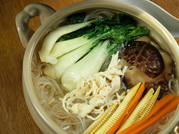 Овощи лучше выкладывать в тарелку по очереди — чтобы они лежали симпатичными видовыми группами. Традиционный китайский крепкий бульон из курицы и свинины делается так: на 20 л воды нужны две большие курицы (по 1,5 кг каждая), 3 кг свинины и 1 кг сыровяленого свиного окорока. Все это ставится на огонь и варится шесть часов с добавлением 5 грамм белого перца горошком — пока не получится 5 л насыщенного бульона.