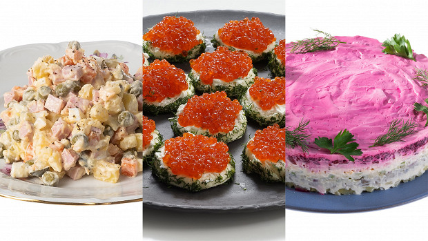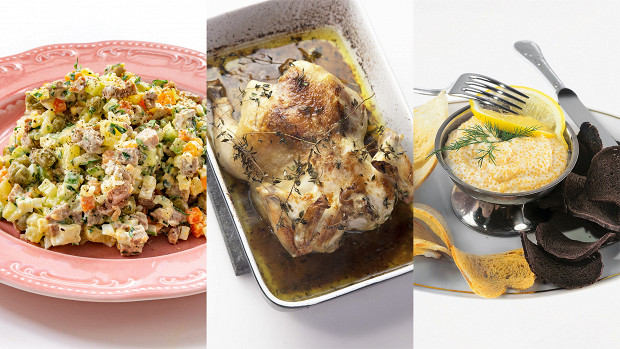 Мы понимали, что 2500 — это три блюда, и каждое из них должно быть на сто процентов запоминающимся и праздничным, чтобы новогодний стол радовал, а не навевал мысли о том, что чего-то не хватает. Чтобы соблюсти традиции, мы поставили на стол икру и оливье, но чтобы сделать это с уважением к кошельку, икру выбрали щучью, а оливье — с говядиной (не удивляйтесь, ниже мы объясним почему). На горячее, конечно же, — любимая курица, но в роскошном исполнении!