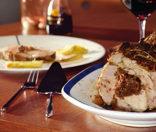 Запеченная буженина с яблоком и сухофруктами в апельсиновой глазури