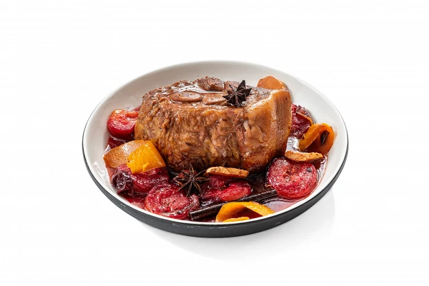 Крайне эффектное внешне, горячее блюдо с привкусом экзотики. Эту нотку придает ему особый марокканский набор специй — рас-эль-ханут, вещь у нас не слишком распространенная, но она легко найдется на маркетплейсах. Когда вы научитесь выстраивать в соусе точный баланс специй, меда, имбиря, миндаля, изюма и чеснока, вы станете королем кухни не только в собственных глазах, но и в глазах тех, кого вы этой свининой будете угощать.