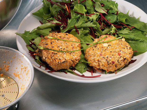 Бургеры из моркови, подсолнечных семян и кунжута с зеленым салатом и свеклой