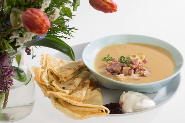 Наваристый жирный суп со сливочным маслом и взбитыми сливками, а еще большим количеством ароматических добавок — майоран, тимьян, гвоздика и дижонская горчица. Блинчики подаются отдельно, и если хотите — то можно и без них.