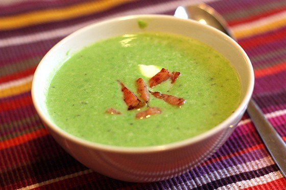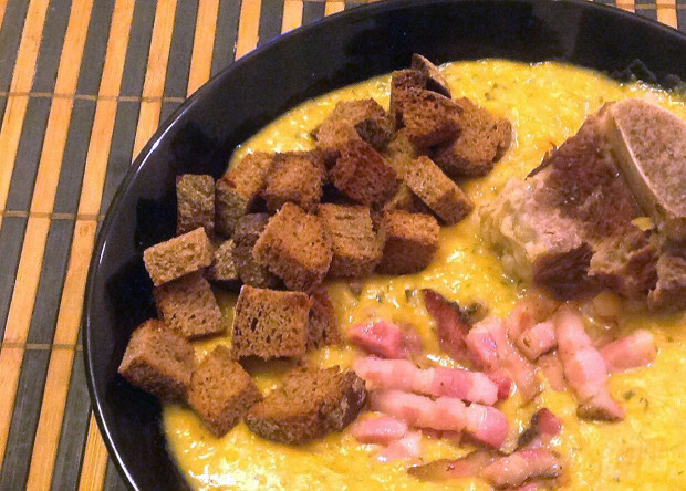 Простейший рецепт, для которого понадобится готовый магазинный бекон — его тут слегка обжаривают и добавляют в уже почти готовый суп. Подавать с сухариками из пшеничного хлеба.