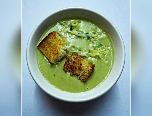 Супы из зеленого горошка — сладкие супы, поэтому к ним в компанию часто добавляют носителя сильных вкусов: тут это порей и чеснок.