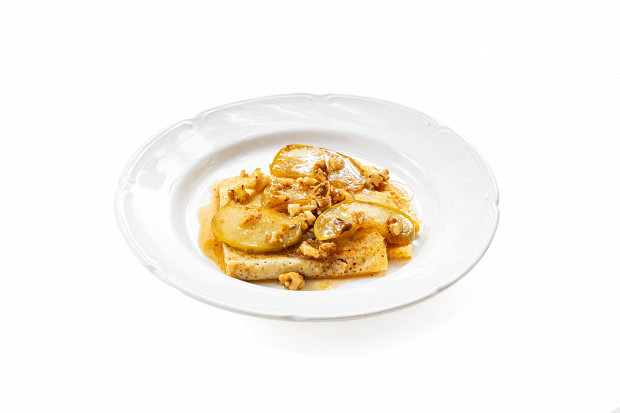 Сладкие блины с печеными яблоками, орехами и медом вызывают ассоциацию с австрийским штруделем, только готовить их проще и быстрее. А если добавить в начинку немного имбиря, у нее появится еще и пряный согревающий эффект, который очень кстати в период сезонных простуд.