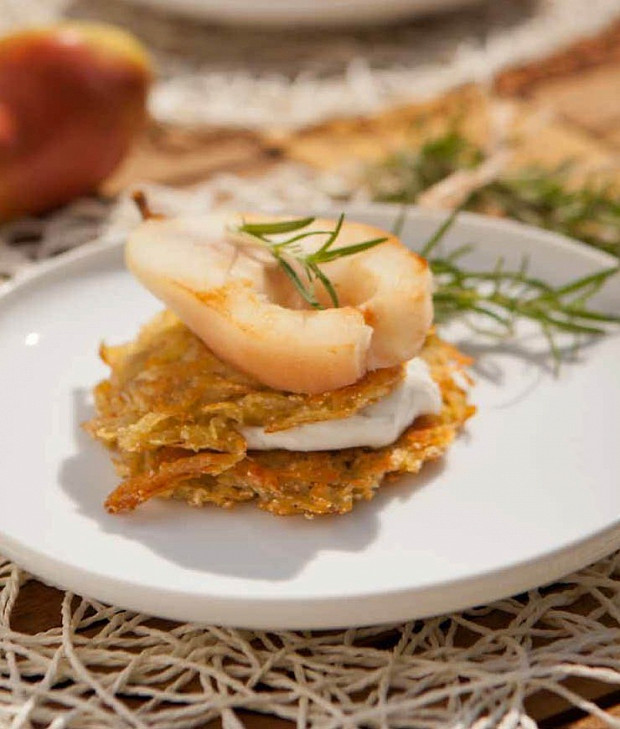 Оладьи сделаны из картошки, манки и яиц и подавать их нужно по двое, проложив между ними творожно-сметанно-чесночную смесь. А уже сверху, на второй блин, кладется обжаренная на сливочном масле груша.