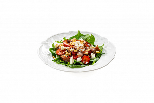 Клубника не всегда уместна и хороша в салатах, но тут у нас все сложилось идеально: терпкость прошутто (а ему клубника очень идет), кислинка феты (греки любят ее складывать с клубникой), яркие орехи кешью, благородное оливковое масло и бальзамические уксус с кремом, крепко объединившие этот союз.