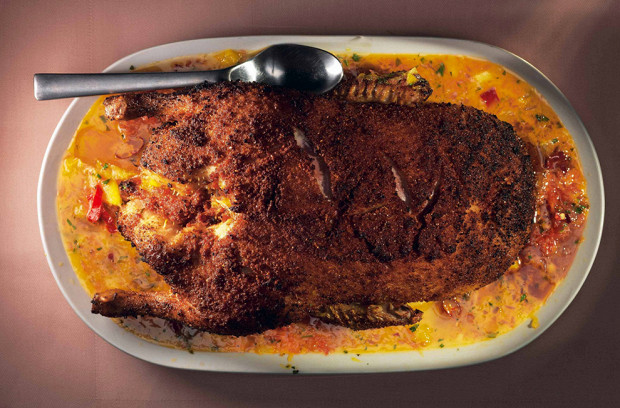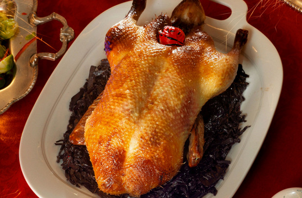 Целая утка, которую готовят, предварительно засолив. Время, проведенное в рассоле, делает мясо утки довольно нежным и ароматным (за счет ярких парфюмерных специй). Без лишних фокусов, с классическим гарниром — эта утка, может, и не наделает фурора за вашим столом, но это спокойное, монументальное и гарантированное удовольствие.