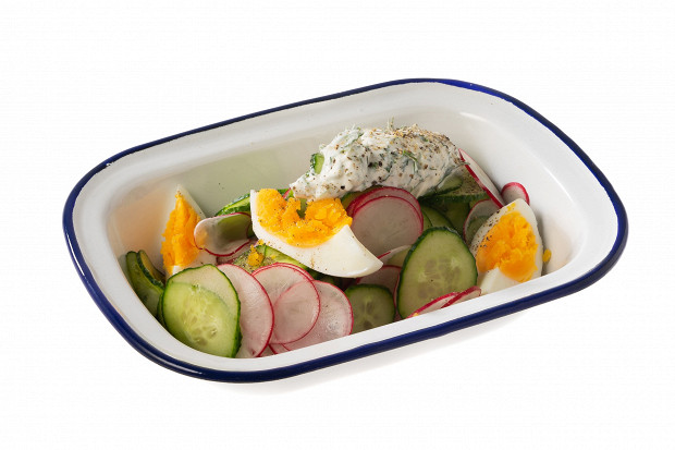 Салат из детства, который был в каждом доме и на каждой даче. А еще он хорош тем, что тут нет четких пропорций, и если у вас мало огурцов и много редиски или наоборот, то пусть так и будет. Практически салат «Весенний», только чуть иначе поданный.