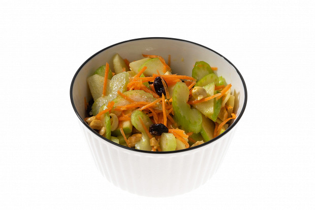 Сочный, терпкий, чуть пряный салат, в котором за свежесть отвечает сельдерей, а за сытость и сладость — изюм и орехи кешью. Идеальная закуска к любому горячему.