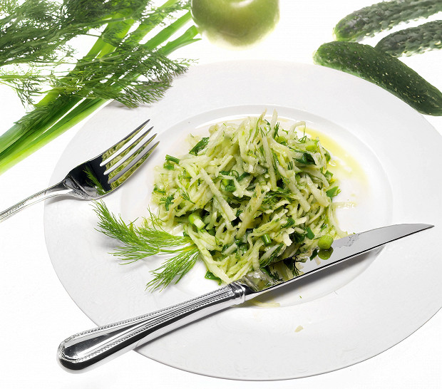 Замечательный салат, которым можно призывать весну (недаром он так называется), которым можно утолять голод и жажду летом, посреди жары. Зелень можно отдельно добавить в салат, а можно смешать ее со сметаной.