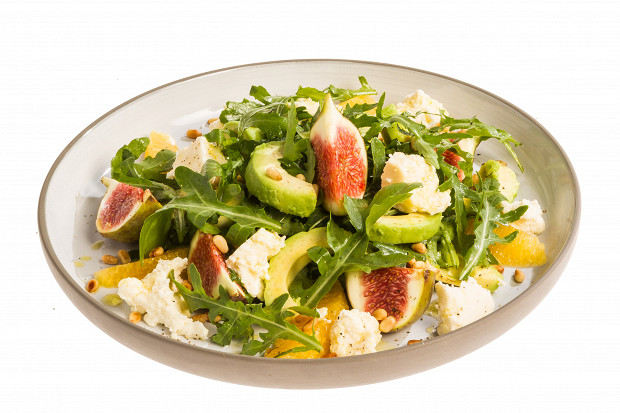 Инжир тут выступает примерно на равных с апельсином и авокадо. Этот союз дополняют сыр, рукола, кедровые орехи и заправка из оливкового масла и рисового уксуса.
