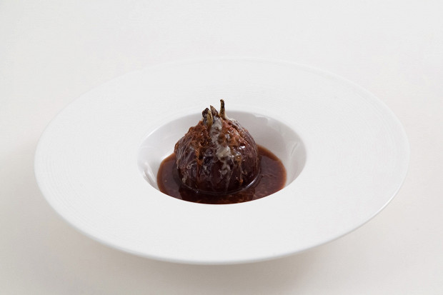 Аскетичное блюдо, в котором инжир начиняется избавленными от соли анчоусами. Дуэт скрепляется творожным сыром.