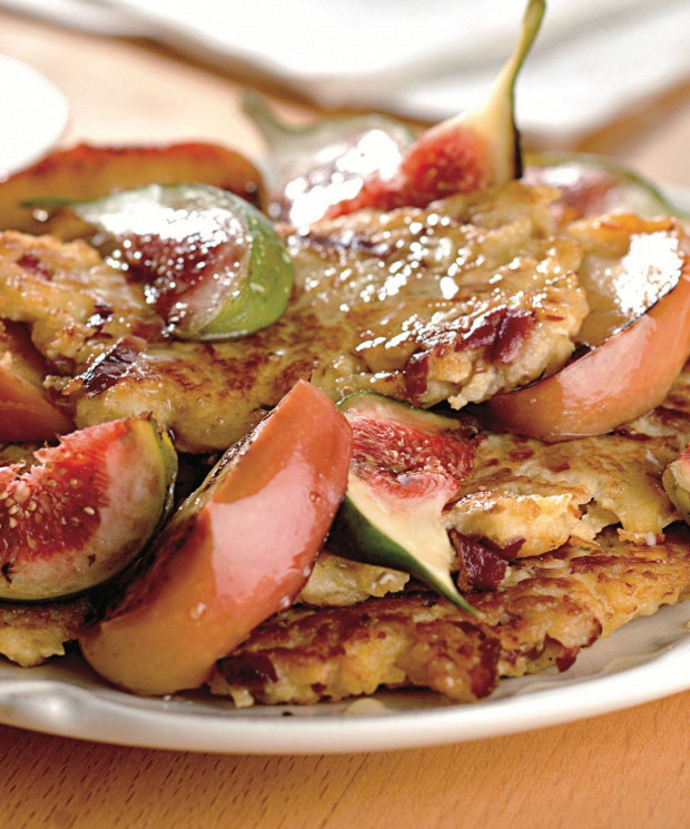 Яблоки трутся на терке и добавляются в тесто. Инжир не требует никакой обработки и просто подается порезанным на дольки вместе с цитрусовым вареньем. Рецепт из книги Алены Долецкой «Утро».