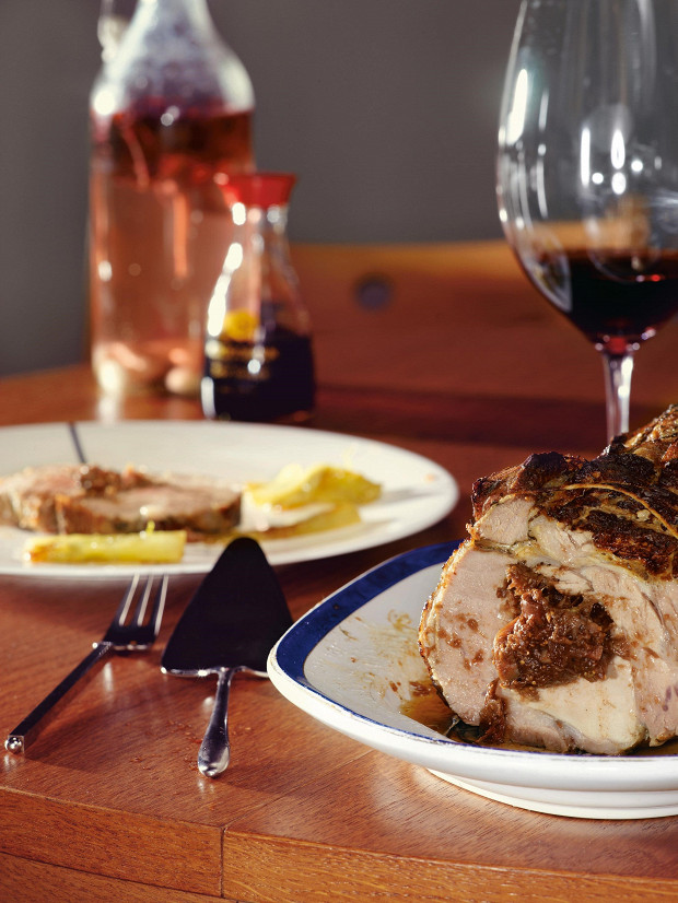 Неторопливое блюдо: свинина сначала шесть часов млеет в рассоле, а затем начиняется фаршем из инжирного пюре и хлебной крошки и запекается в духовке. Хороша в горячем и холодном виде.