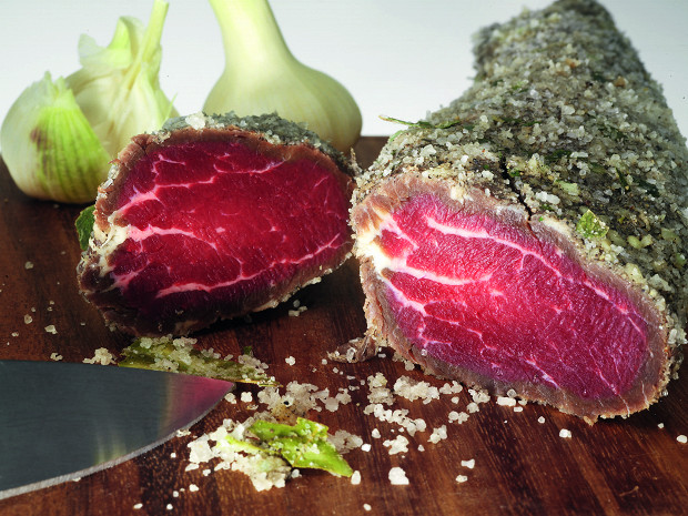 Автор этого рецепта — бренд шеф киевского холдинга Fozzy Марко Черветти. Количество соли здесь может варьироваться от 50 до 500 г на килограмм мяса — меняться будет степень просолки и время, нужное для приготовления. Если соли брать совсем немного, до 100 г, мясу нужно готовиться в течение семи недель. Цвет готового мяса будет зависеть от времени выдержки; после семи недель оно будет выглядеть темнее.