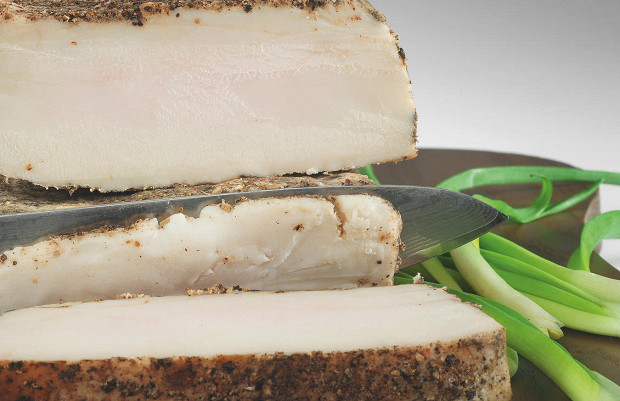 Автор рецепта — шеф-повар «Шинка» Елена Никифорова— для приготовления сала советует выбирать верхнюю часть грудинки. В нижней части — почеревке — уже начинаются прослойки мяса.