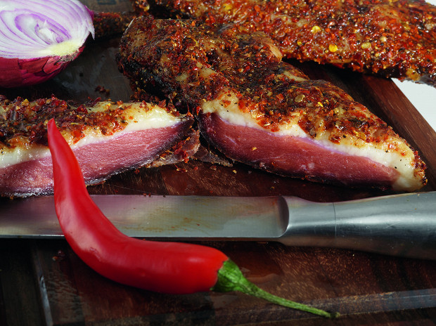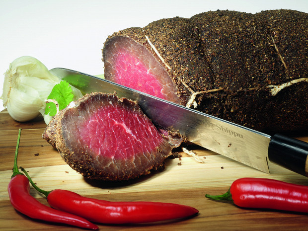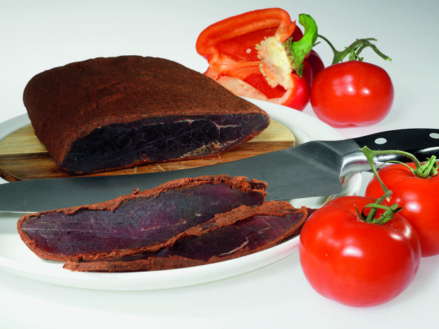 Благодаря нескольким этапам засолки и вяления говядина приобретает глубокий, почти черный цвет.