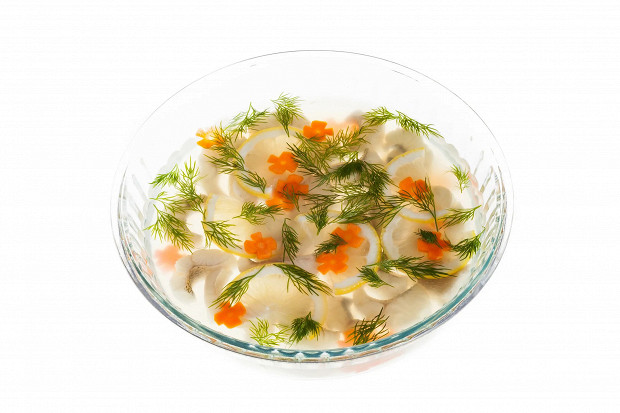 Обычно заливное подают на стол в той же посуде, в которой оно застывало, поэтому позаботьтесь заранее, чтобы вид у нее был презентабельный. Особенно эффектно прозрачное заливное смотрится в прозрачных хрустальных и стеклянных салатниках. К оливье подается рыбный нож или лопатка. И, конечно, хрена и горчицы жалеть не стоит, хотя, если вы послушались наших советов, то и без всяких приправ никто не скажет «Какая гадость!», скорее: «Что за прелесть ваше заливное!»